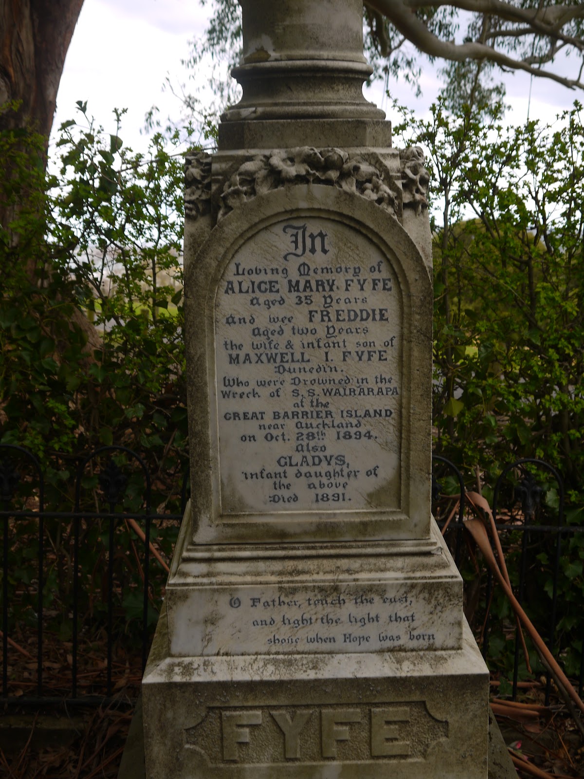 Mr M. J. Fyfe, of Dunedin, has arrived in Auckland to identify the bodies of his wife and child. When last seen, Mrs Fyfe had her baby in her arms, wrapped in a white woollen shawl, her only clothing being a nightdress. They hung on by the rails, the sea washing continually over them for four hours, when at length a big wave washed them all overboard. -Auckland Star, 9/11/1894.