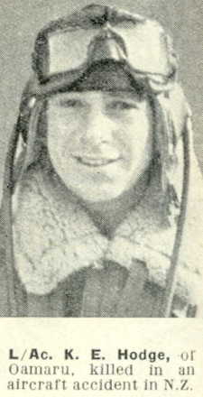 Leading Aircraftman Keith Edwin Hodge, who was killed at a South Island air station on Monday, when two planes collided in mid-air, was the son of Mr and Mrs A. E. Hodge, of Avon street, Oamaru. He was 26 years of age. He was educated at the Oamaru South School and Waitaki Boys’ High School, where he gained a Macmillan Brown prize for popularity. On leaving school, he joined the staff of his father’s Economic Drapery business, managing it for a period during his father’s absence. Aircraftman Hodge was a prominent athlete. He excelled at swimming, cricket, and Rugby football. He was a member of the Old Boys Football Club and a North Otago representative player. At the outbreak of the war he enlisted for the air force, but did not join up at that time. He joined the army, and served with the New Zealand Division in the Pacific combat area for a year and nine months, and, having previously enlisted for the air force, he was recalled to New Zealand to undergo air force training. His two brothers are serving overseas, one with the Australian Air force in New Guinea and the other with the 2nd N.Z.E.F. in Italy.